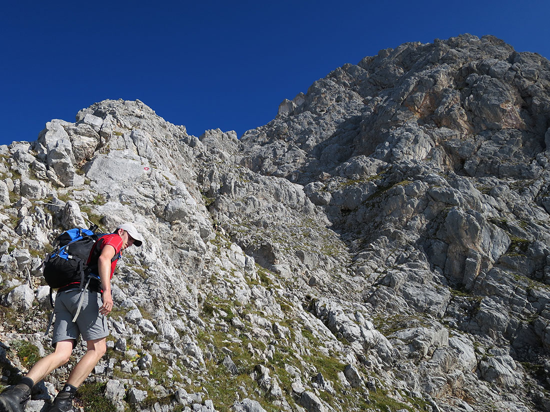 Los geht's mit Schrofensteigerei. Der Weg ist 1a markiert, was nichts daran ändert, dass es uns an Vorstellungskraft fehlt, wie man bitte durch diese Wand durch soll.