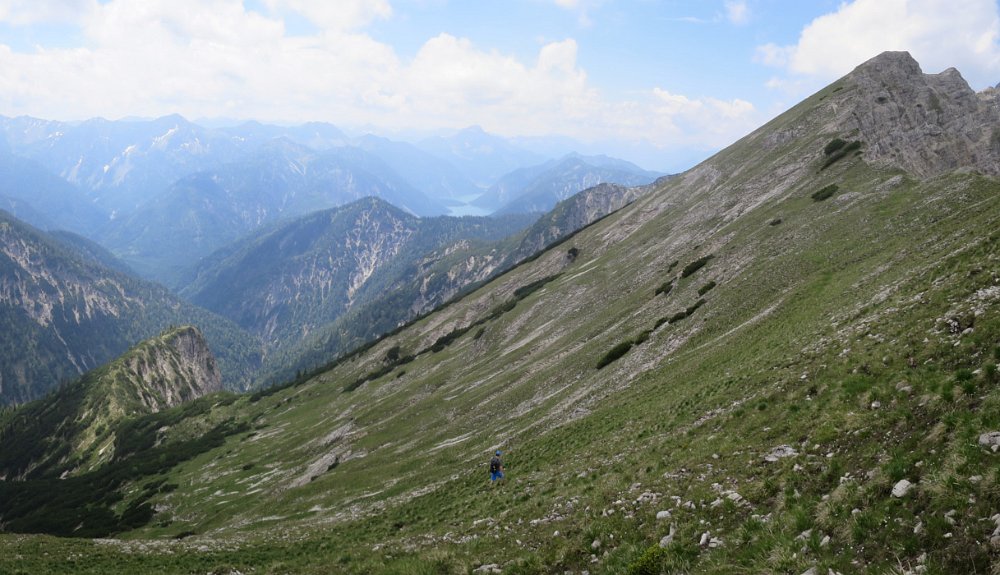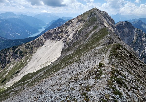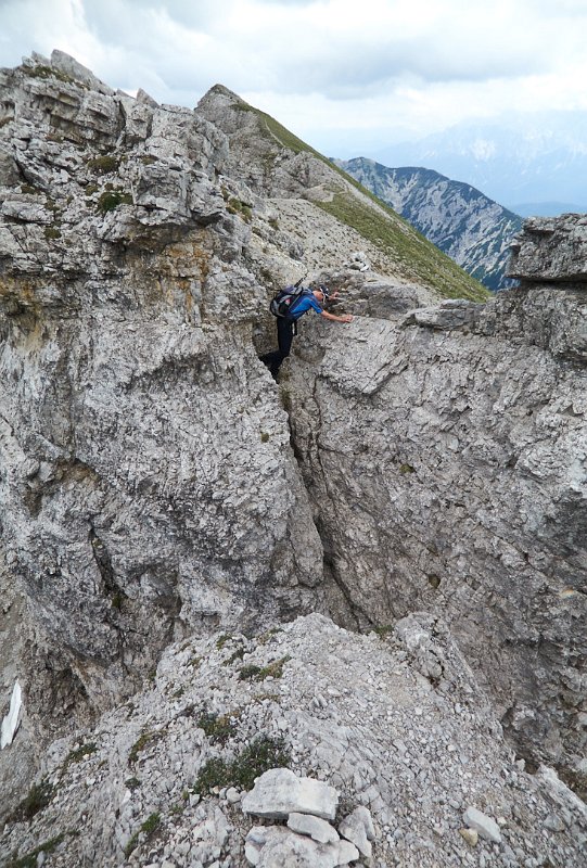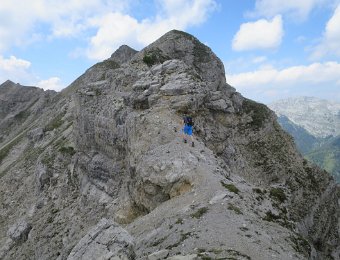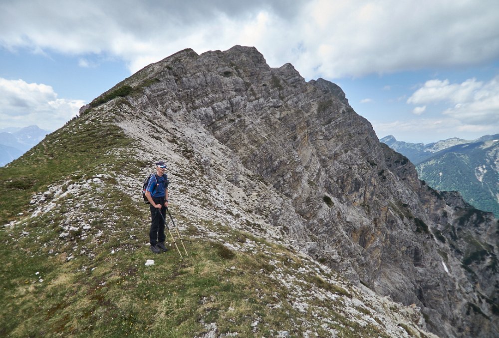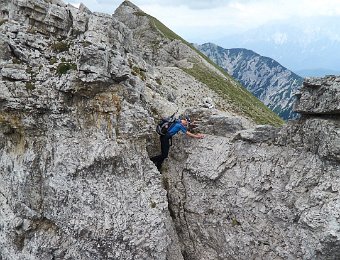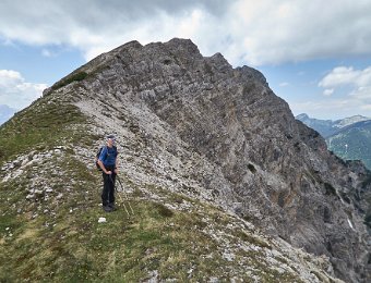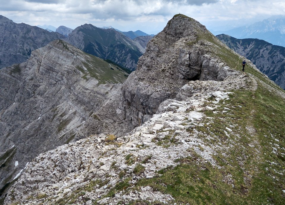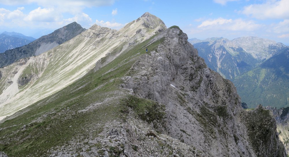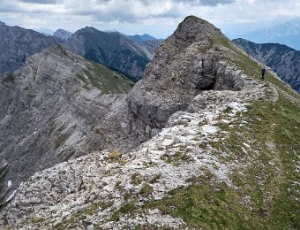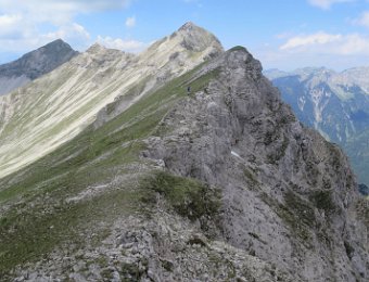 Die Überschreitung der Geierköpfe macht man am besten von Ost nach West. Wir gingen vom Ammersattel aus los, um die lange Querung unterhalb der Köpfe nicht am Anfang zu machen, sondern um möglichst früh in die Action einzusteigen. Das Gelände zwischen Ost- und Hauptgipfel ist anspruchsvoll, weil steil, bröselig und teilweise Absturzgelände. An den schwierigeren Kletterstellen ist der Fels fester. Man muss trotzdem immer gut aufpassen. Wo man am besten zum Ostgipfel vom markierten Weg abzweigt, haben wir nicht raus bekommen. Es gibt keine Trittspuren. Der Ostgipfel ist eh langweilig. Wir haben ihn ausgelassen.