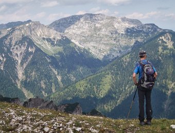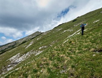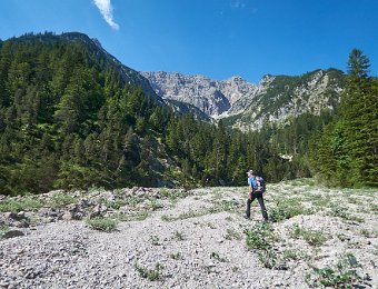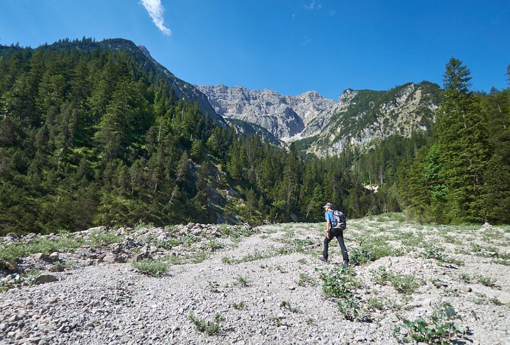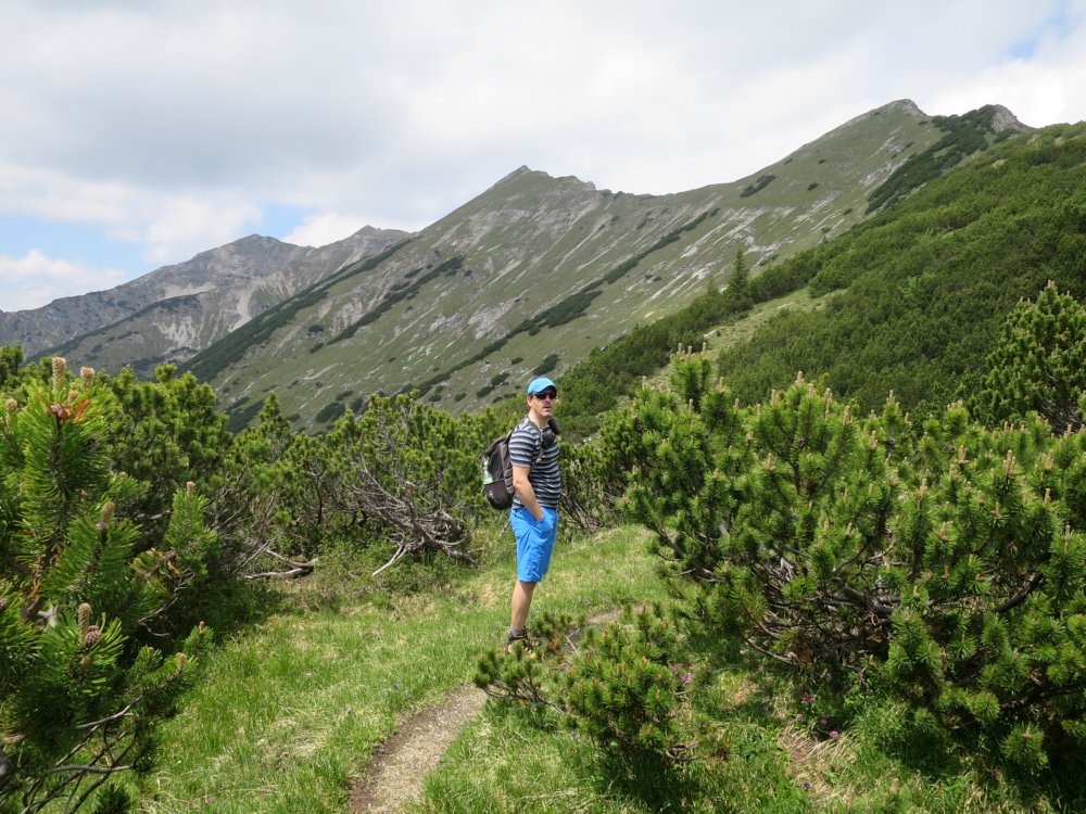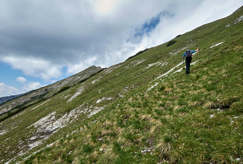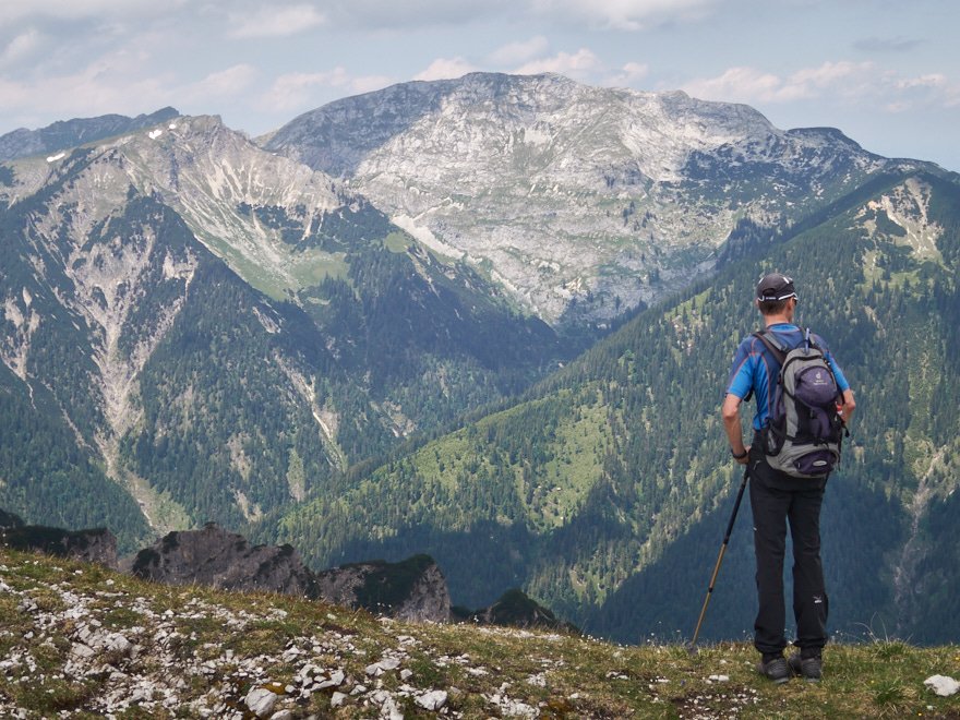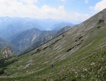 Die Überschreitung der Geierköpfe macht man am besten von Ost nach West. Wir gingen vom Ammersattel aus los, um die lange Querung unterhalb der Köpfe nicht am Anfang zu machen, sondern um möglichst früh in die Action einzusteigen. Das Gelände zwischen Ost- und Hauptgipfel ist anspruchsvoll, weil steil, bröselig und teilweise Absturzgelände. An den schwierigeren Kletterstellen ist der Fels fester. Man muss trotzdem immer gut aufpassen. Wo man am besten zum Ostgipfel vom markierten Weg abzweigt, haben wir nicht raus bekommen. Es gibt keine Trittspuren. Der Ostgipfel ist eh langweilig. Wir haben ihn ausgelassen.