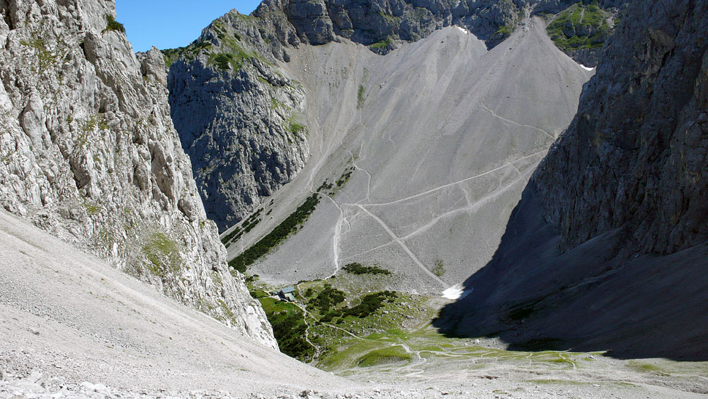 Das Dammkar mit der Hütte. Unmittelbar hinter der Hütte der Predigtstuhl.