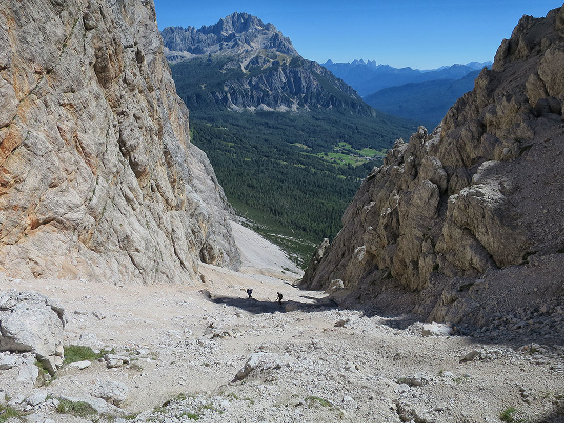 | Und wie bei jedem anständigen Dolomitenberg bekommt man es irgendwo mit Geröll zu tun. Diese Reiße ließ sich, wenn man weiß wie es geht (die zwei Nasen im Schatten checkten nix), recht gut abfahren. Dann kommt noch eine längere Strecke durch Latschen, wo man in der Sonne gegrillt wird, runter in den Wald und zurück zum Parkplatz. | |