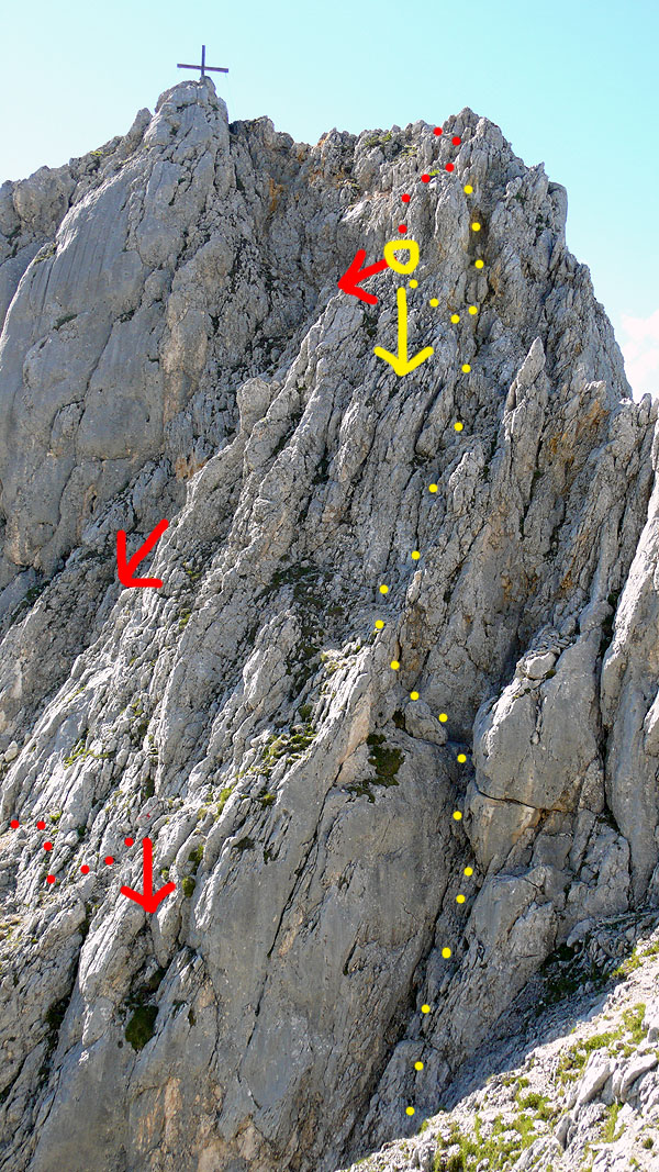 | Viererspitze035 | Der Abstieg ist überraschend kompliziert. Die Beschreibungen in den Führern sind allesamt nutzlos. Ganz oben ist es noch logisch. Man peilt einen Bohrhaken an (gelber Kreis). Von dort ist es nicht mehr klar ersichtlich, wie es weitergeht. Das Gelände ist sehr gefährlich. Steil, bröselig (einige frische, gelbe Felsausbrüche) und unten ein senkrechter 10m Abbruch. Nachdem der rechte Teil schlecht einsehbar war, haben wir in den übersichtlichen Teil abgeseilt (rot). Mit einem 60er Seil reicht's nicht bis runter. Also einen Block gesucht und eine Schlinge geopfert für die zweite Etappe. Am besten ist es, sich am Bohrhaken mit 60er Doppelseil in Falllinie abzuseilen (gelber Pfeil). Vielleicht geht es auch auf zweimal und es steckt wo noch ein Haken. Die gelben Punkte sind nach meinem Verständnis die in den Führern beschriebenen Routen. | |
