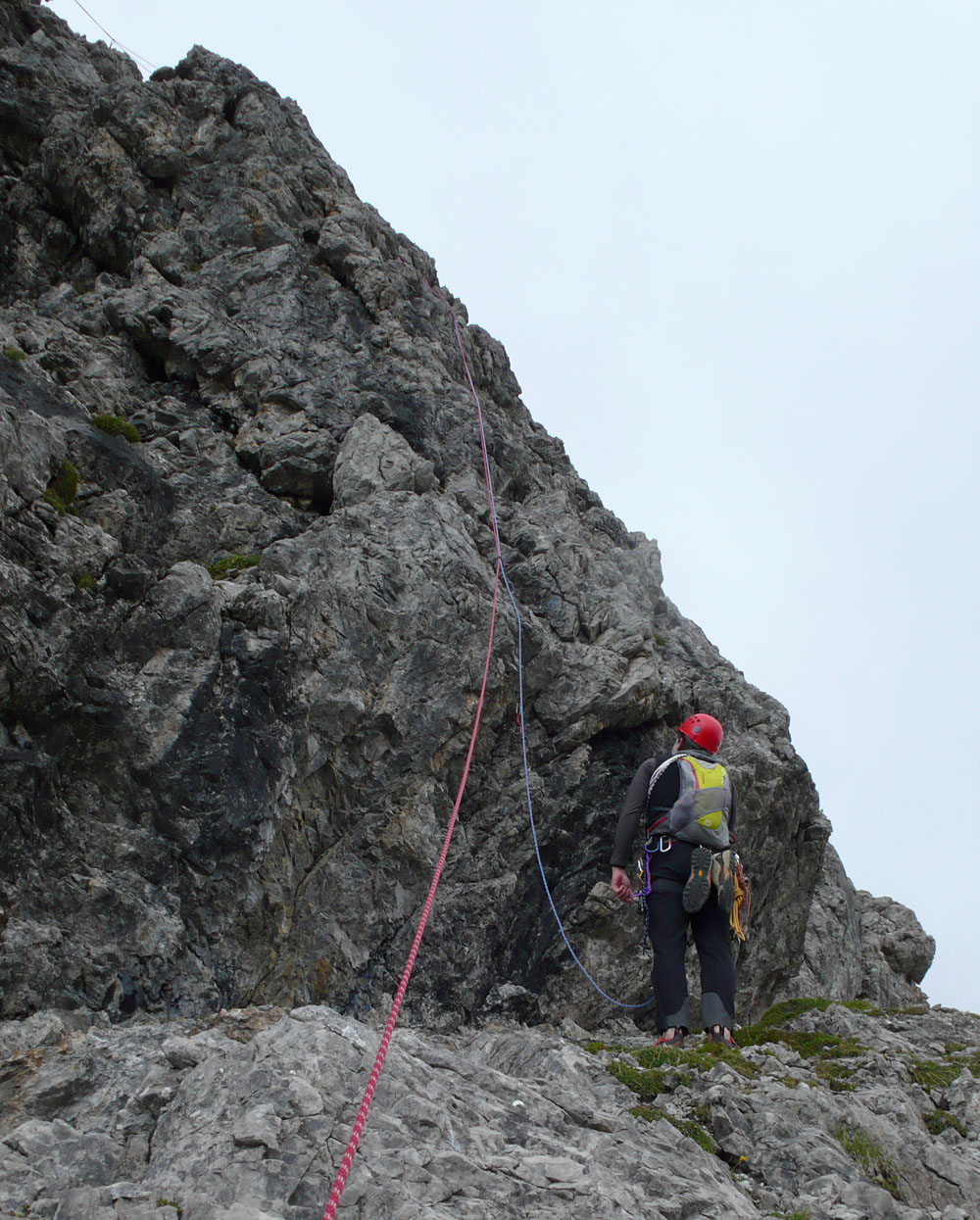 Der Alpengeist betrachtet die Schlüsselstelle (V-), die immerhin bequem vom Boden aus zu bewältigen ist.