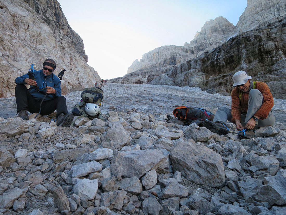 | Am Schneeketten-Anlegeplatz. Auf der Tuckett Hütte traf ich auf zwei lustige fränkische Alpinisten, die für die nächsten zwei Tage den gleichen Weg hatten. Wir hatten eine super Zeit miteinander. | |