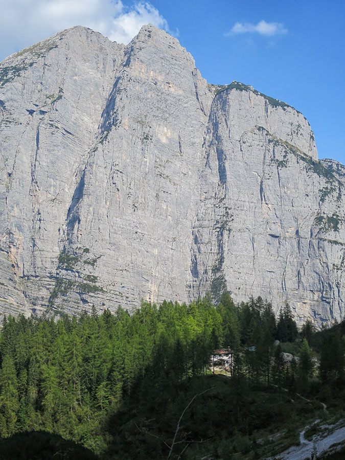 | Die faszinierende Riesenwand des Croz dell'Altissimo mit dem versteckten Refugio Selvata im Kiefernwald. Und so endete bald der dritte Tag der Brenta Runde, die der Höhepunkt meiner Reise werden sollte, und meine Erwartungen übertroffen hat. Man muss da einfach mal gewesen sein. Das Erlebnis, sich mehrere Tage durch diese wilde Felskulisse zu bewegen, ist einmalig. Mit meinen zwei sympathischen Begleitern hatte ich eine noch bessere Zeit als wenn ich alleine unterwegs gewesen wäre. Mit dem Wetter hatte ich außerdem noch Glück. Um diese Zeit kann es schon Neuschnee geben da oben. | |