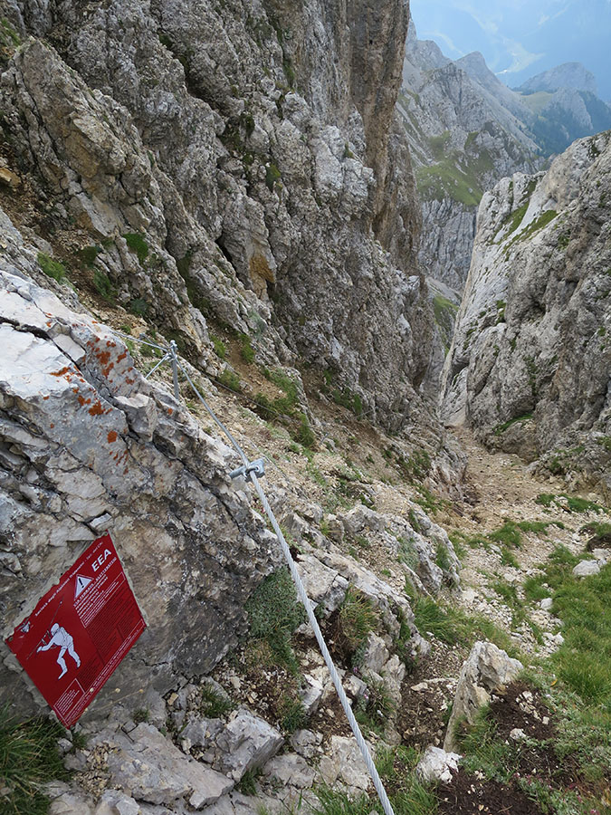 Der schwierigste und letzte Teil des Steigs geht vom Sas Aut eine steile Schlucht hinunter. Hier waren Reste eines befestigten Wegs zu sehen, den die Erosion weg geputzt hat.