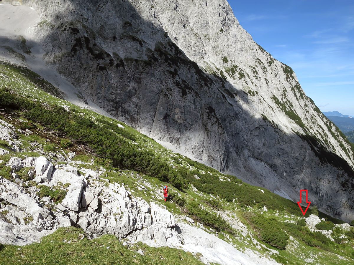 Der markante Fels mit seinem Nadelbaum ist der Fixpunkt für den Wiedereinstieg in den Latschengürtel.