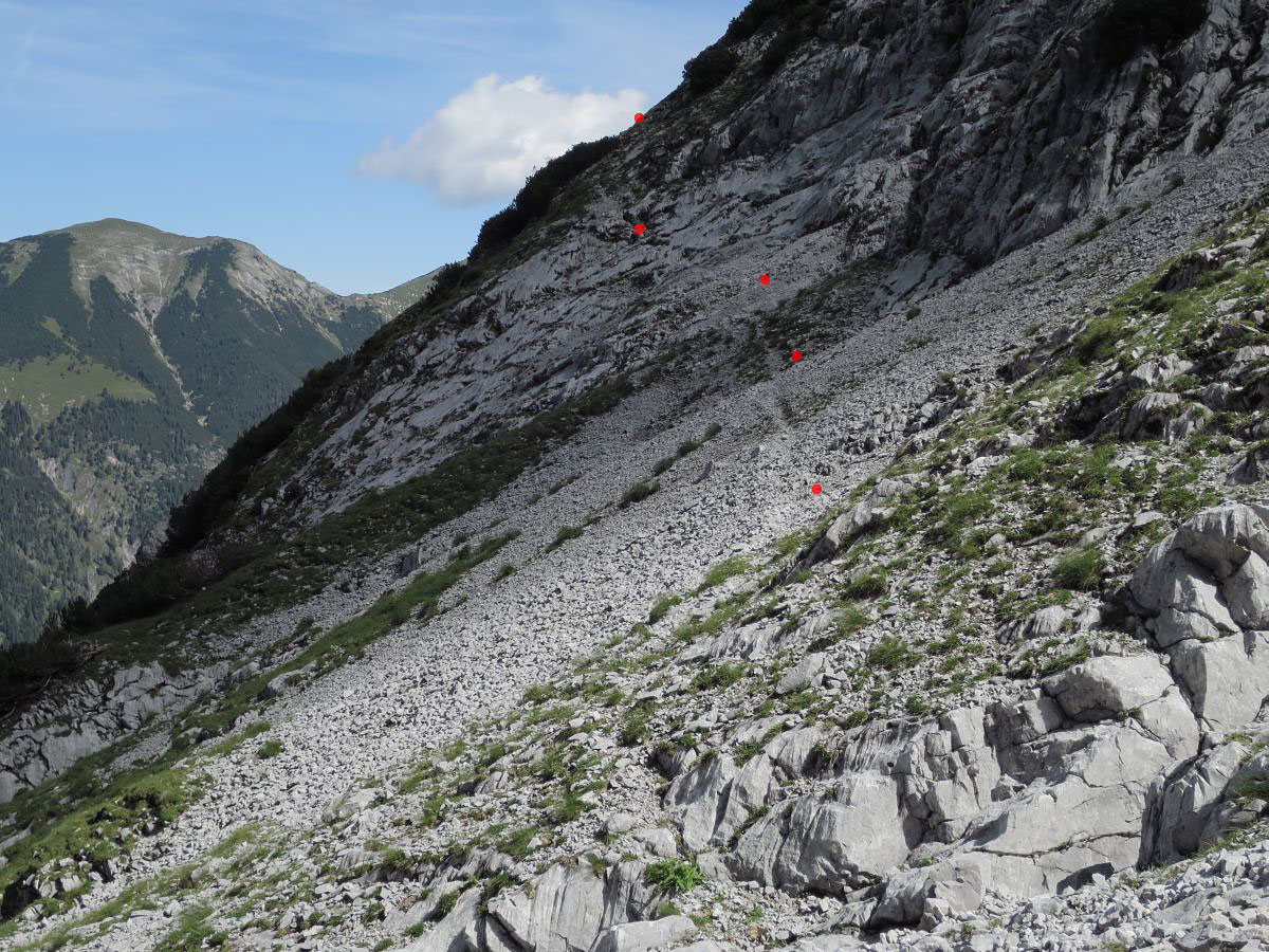| Der Einstieg mit seiner zarten Wegspur. Danach folgt Geländeinstinkt und Begehungsspuren interpretieren. Steinmänner kommen im ersten Teil nur sehr spärlich, aber wenn man sich immer an den zwingend einfachsten Weg hält, liegt man richtig. | |