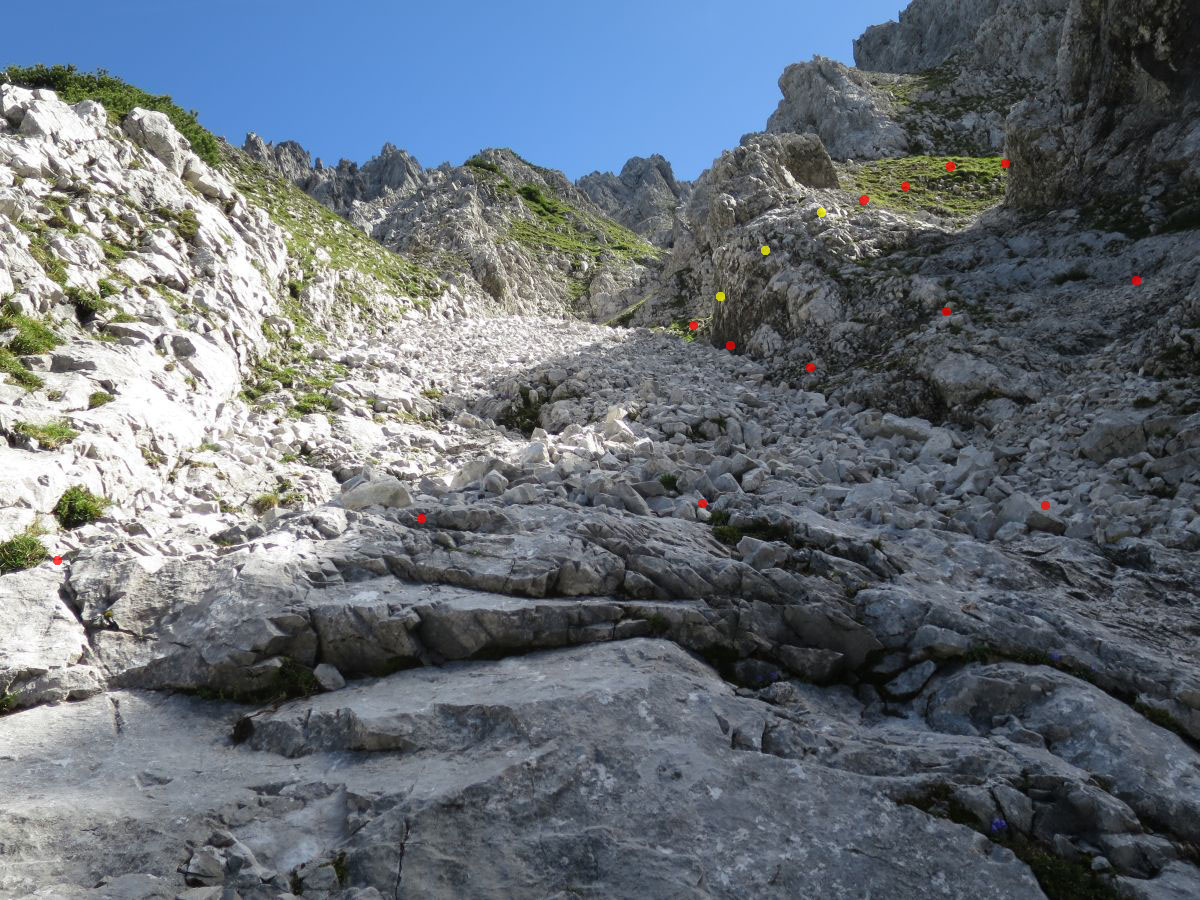 | Die Rinne teilt sich. Das Gelände ist sehr unübersichtlich. Am besten ist es, zuerst am rechten Rand etwas hoch zu steigen, dann in die linke Rinne wechseln und diese bei nächster Gelegenheit wieder nach rechts verlassen. | |
