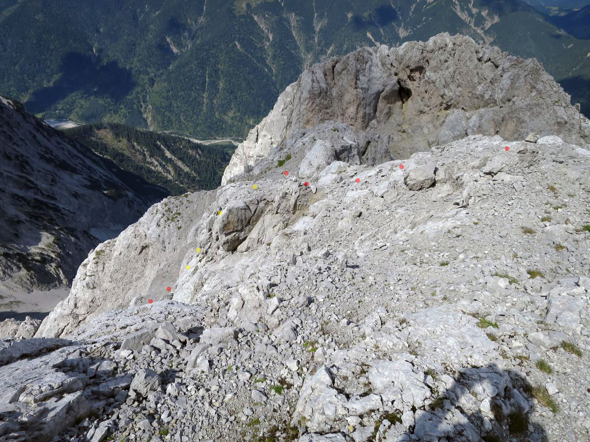 Und wieder runter den Bröselhaufen. Man marschiert so weit nach draußen, bis eine feinschottrige Rinne beginnt. Nicht zu früh links runter!