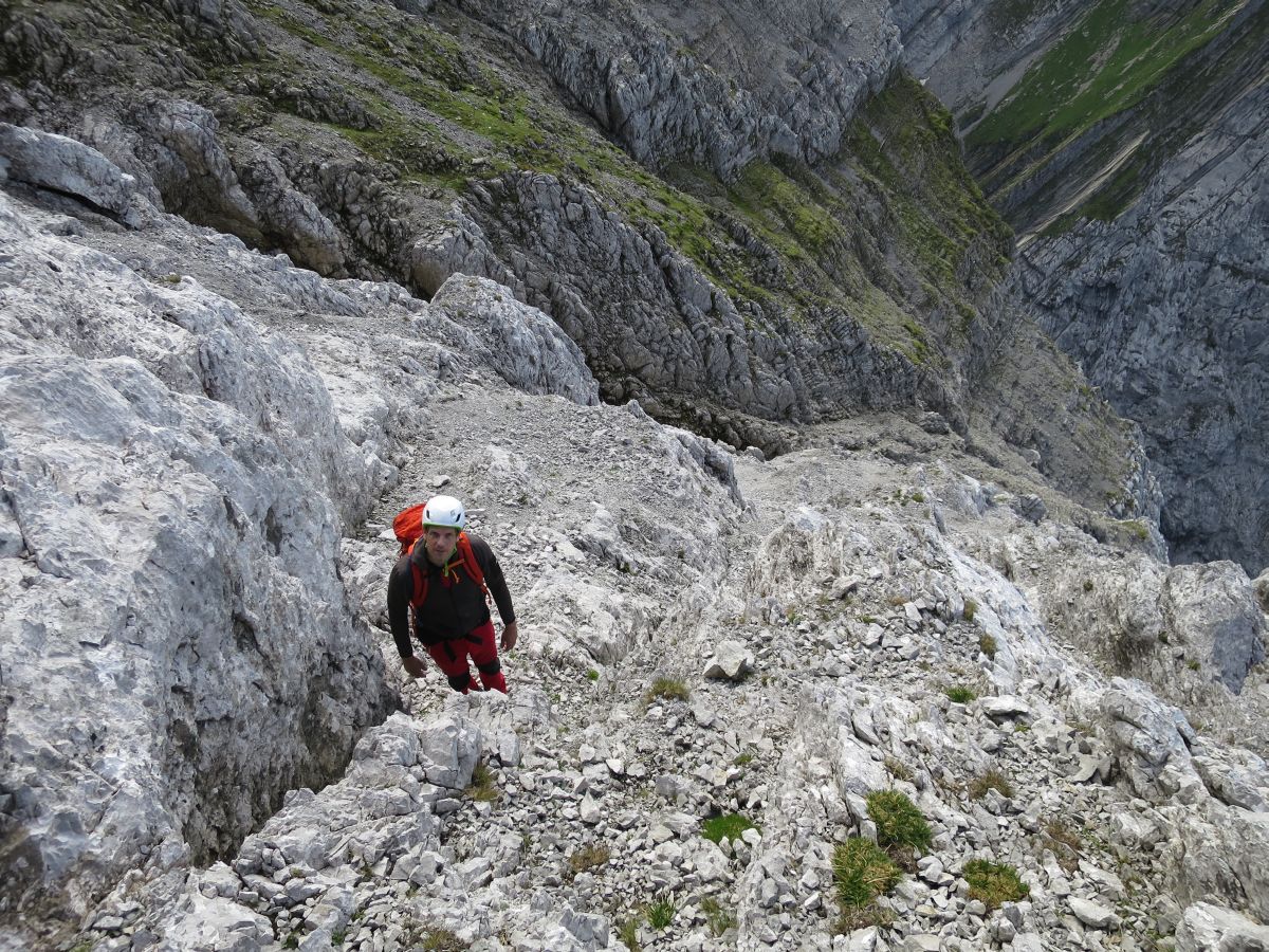 So sieht es unterhalt der Hauptrinne aus. Mit Schotter übergossene Stufen. Nicht wirklich schwierig, aber tückisch. Jeder Schritt muss genau bedacht werden.