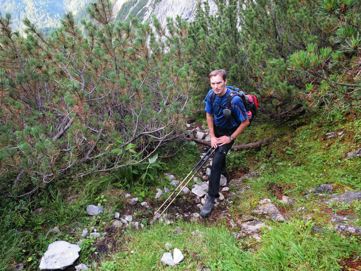 Der Latschengürtel im Falkenkar nimmt uns in Empfang mit seinem erdig-schmierigen Trampelpfad. Es erwarten uns 400Hm Rumgeeier und richtige Arbeit. Henning hat keinen Bock mehr...