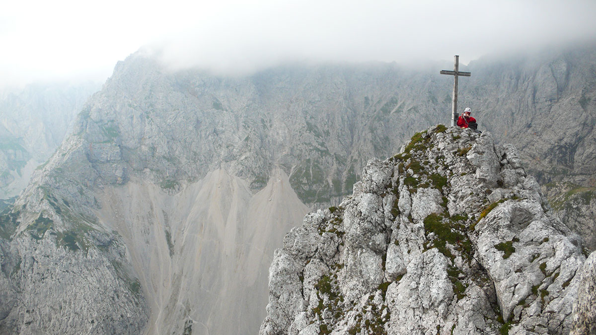 | Der Gifpelaufbau vermittelt ganz gut, was einem beim Rückweg noch bevorsteht. 300m ausgesetzer Bröselgrat. Das Wetter war hier schon recht bedrohlich und am Ende wurd's auch noch finster, weil wir nicht schnell genug vorwärts kamen in dem unübersichtlichen und mühsamen Gelände. | |