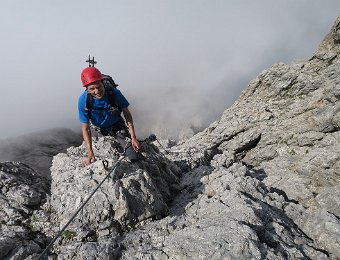 Der Klettersteig führt zuerst über den Sockel in Bildmitte und verfolgt dann konsequent den leichtesten Durchstieg bis hinauf zu dem Türmchen links neben der…