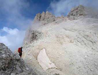 So, nächste Aufgabe: die Vezzana. Das ist nur der Vorgipfel, der eigentliche Gipfel ist noch ein Eck weiter hinten. Das steile Schotterfeld wirkt nicht…