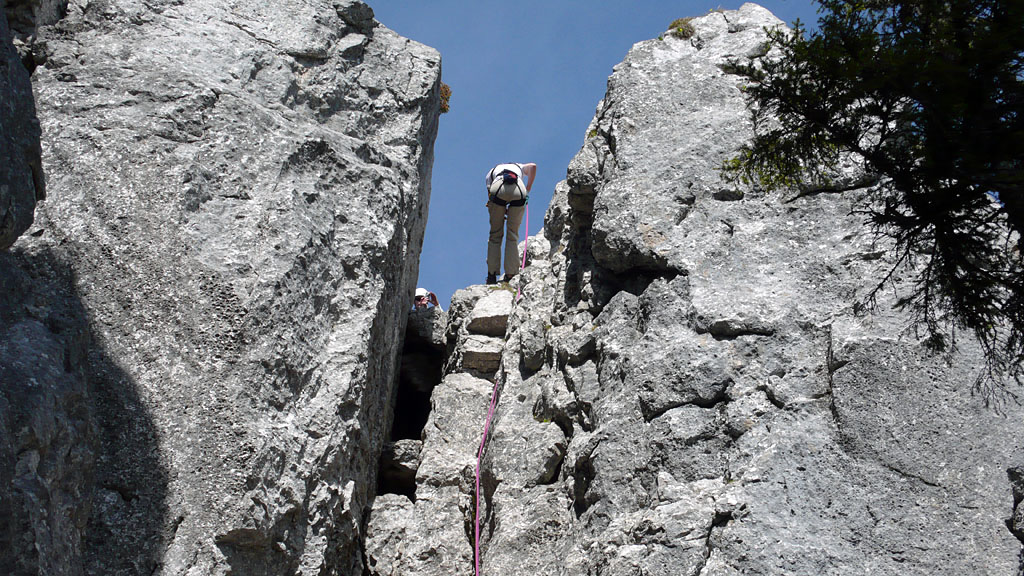 Das 60m Seil um den Sockel vom Gipfelkreuz gewickelt gibt eine gute Abseile bis ans Ende der Rinne. Der komplett marmorierte Kamin wäre im Abstieg mehr als ekelhaft.