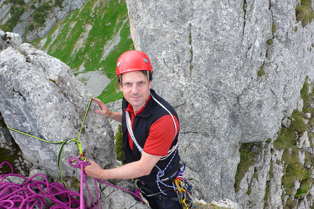 | Jetzt hätte eigentlich noch das kurze, kleingriffige 5m Wandl (IV) im Hintergrund gefehlt. Es hat aber schon lästige Regenschauer runterlassen, also haben wir den Ausstiegshaken der "Vroni" Route (direkt hinter mir) zum Abseilen verwendet. Wer will schon den Plankenstein Normalweg bei Nässe runterschlittern! | |
