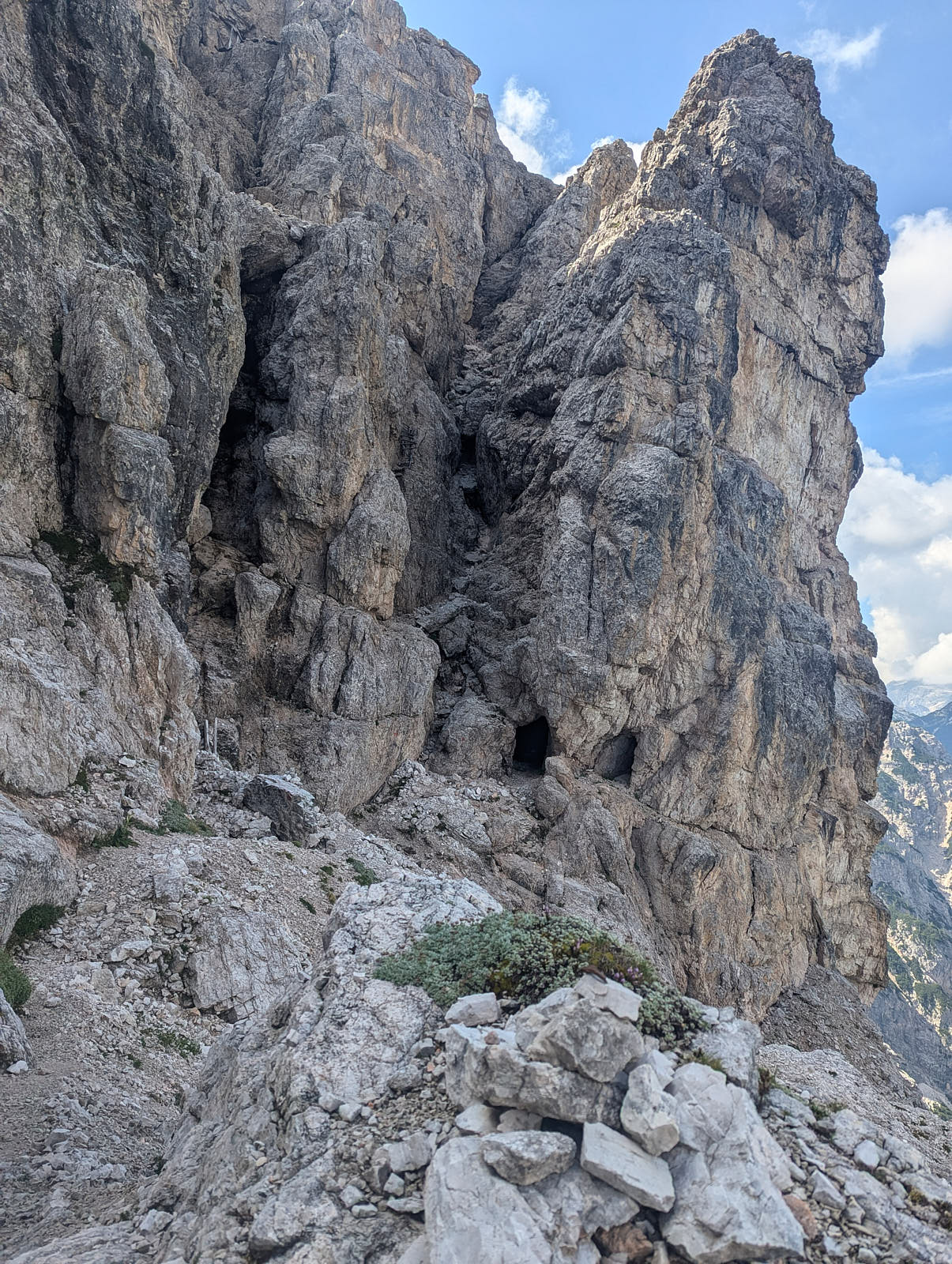 Nach dem langen Zustieg durch den Wald erreicht man die ersten alten Stellungen und quert unter der Wand durch zum Einstieg.