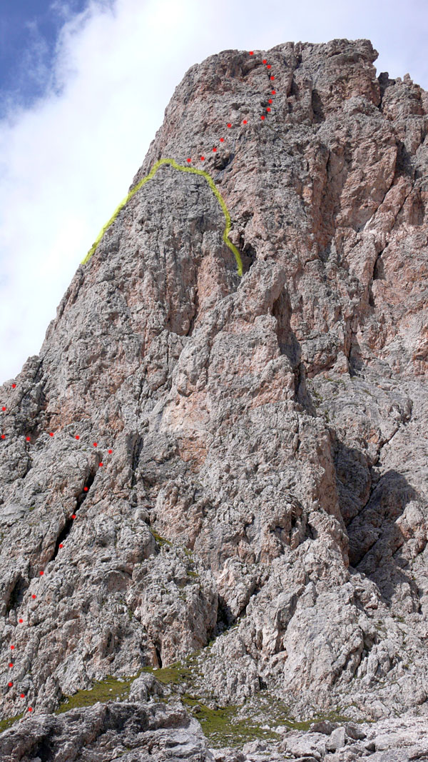 | Die komplette Route ist vom Zustieg aus nicht zu sehen. Der vorgelagerte Pfeiler hebt sich optisch nicht ab. Die gelbe Linie zeichnet seinen Umriss. Die Route führt links um den Pfeiler herum. Ein gemütliches, grasiges Band endet an der "Nahtstelle" des Pfeilers mit der Hauptwand. Der Standplatz trohnt wie eine Kanzel gut 80-100m am Abgrund. Und dann kommt ein 6m Quergang direkt in die Wand raus! Mittendrin sieht man weder die Wand darunter, noch den Boden. (Erich: "Ziemlich luftig"). Mama Mia!! Man muss sich an Untergriffen zusammengefaltet an einem abdrängenden Vorsprung vorbeiarbeiten. Die Tritte sind freundlich groß zum Glück und der Fels knackfest. Ein einziger Haken steckt. Dem Alpengeist haben ordentlich die Knie geschlottert. Eine echte Mutprobe! Für den Nachsteiger zwar nicht wirklich gefährlich, aber wer will im Ernstfall schon ins Leere rauspendeln? | |