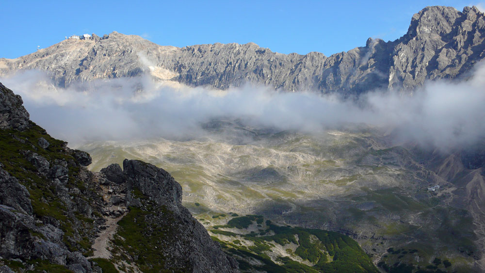 Nächster Tag. Richtung Gatterl hat es uns kurz eingeschifft. Der Jubiläumsgrat bis zu den Höllentalspitzen streckt sich durchs Bild.